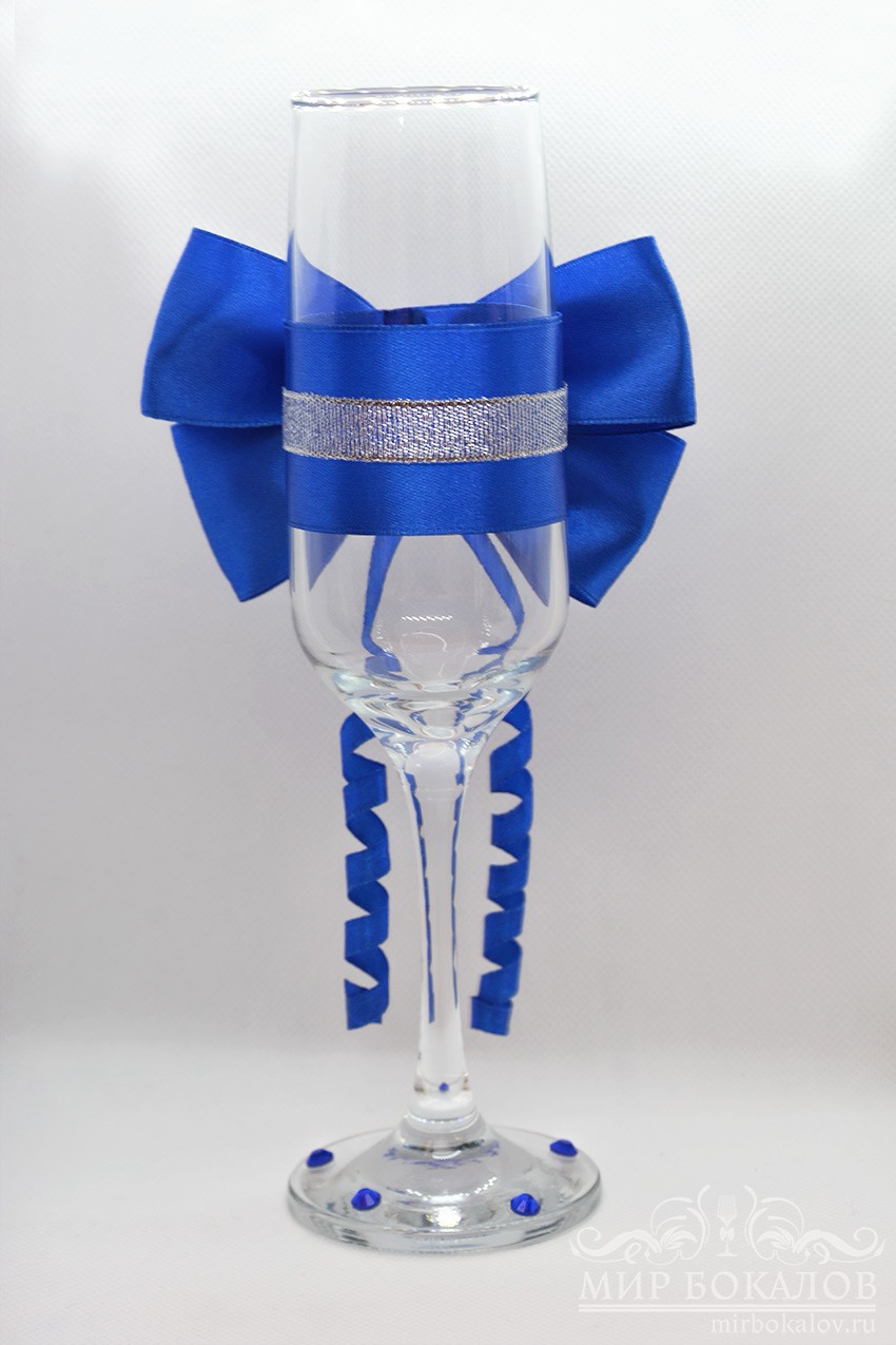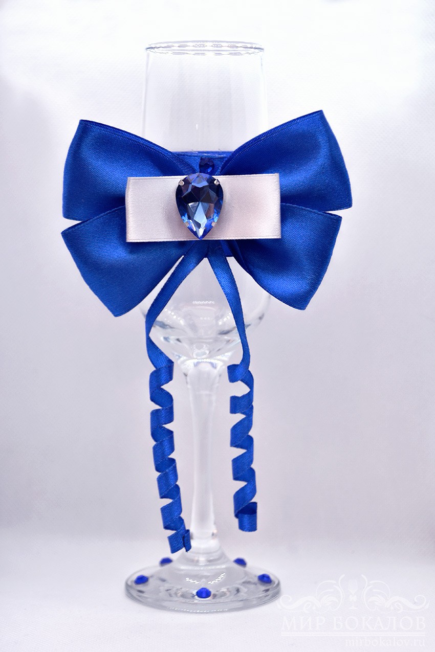 Один бокал, украшенный синей атласной лентой. Спереди бокала прикреплен большой бант из синего и белого атласа, по центру расположен большой синий камень, красиво переливающийся на свету. Сзади поверх синей атласной ленты украшен лентой из парчи серебряного цвета.