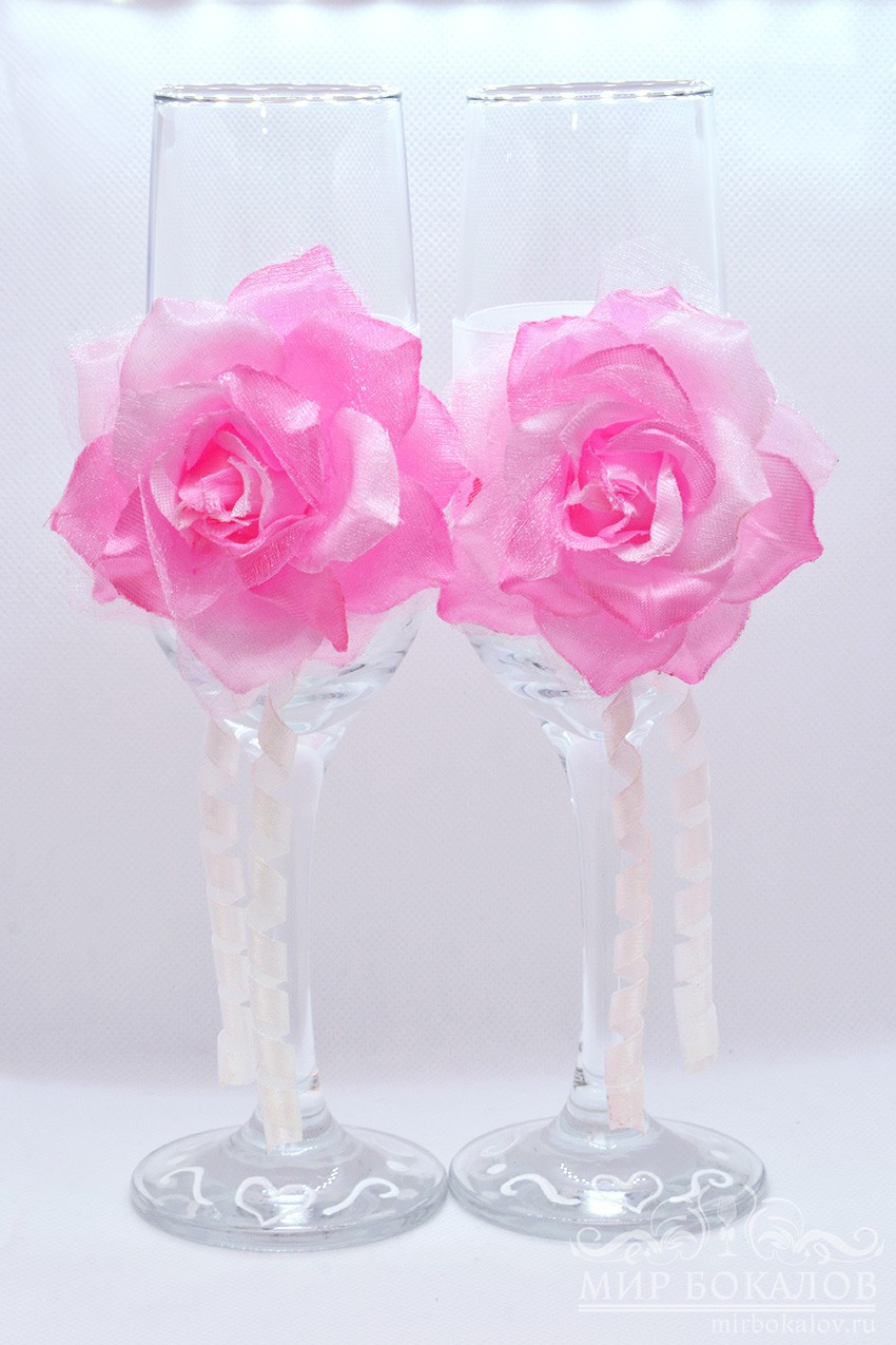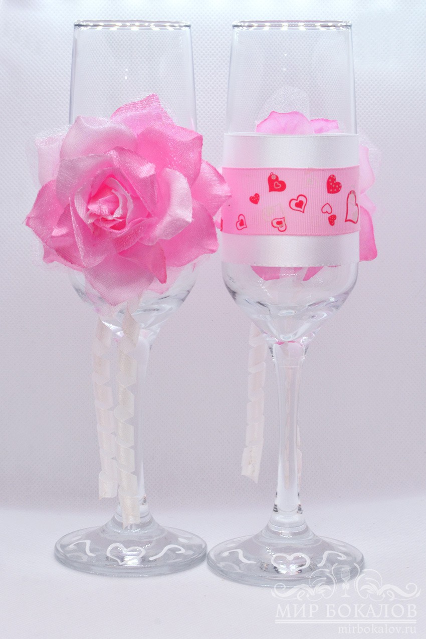 Набор из двух бокалов, украшенный белыми атласными лентами и розовой репсовой лентой с сердечками.  Спереди закреплена большая розовая роза. Основание ножки украшено росписью в виде сердец.