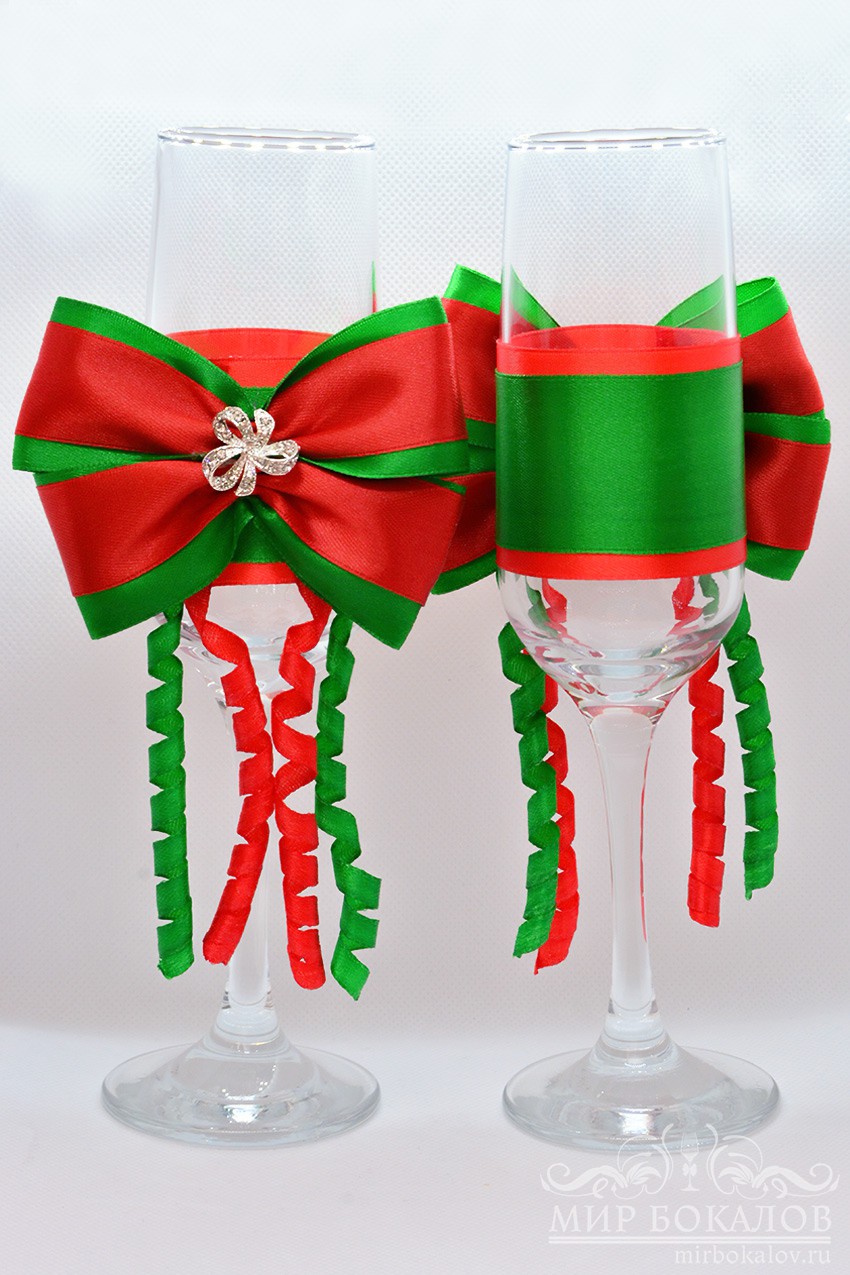 Набор из двух бокалов "Беллуно" украшен красными и зелеными атласными лентами. По центру расположен бант с аккуратной брошью.