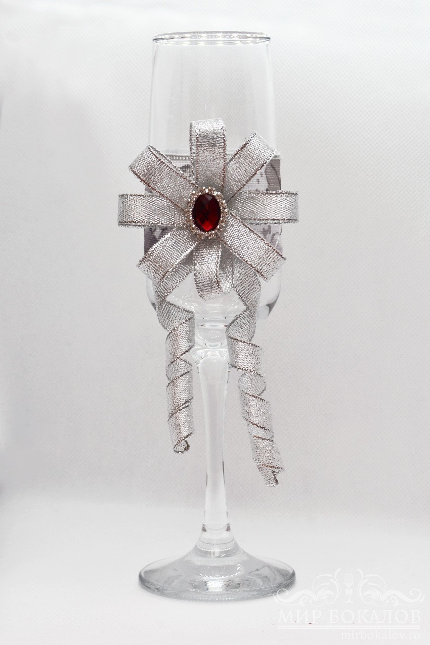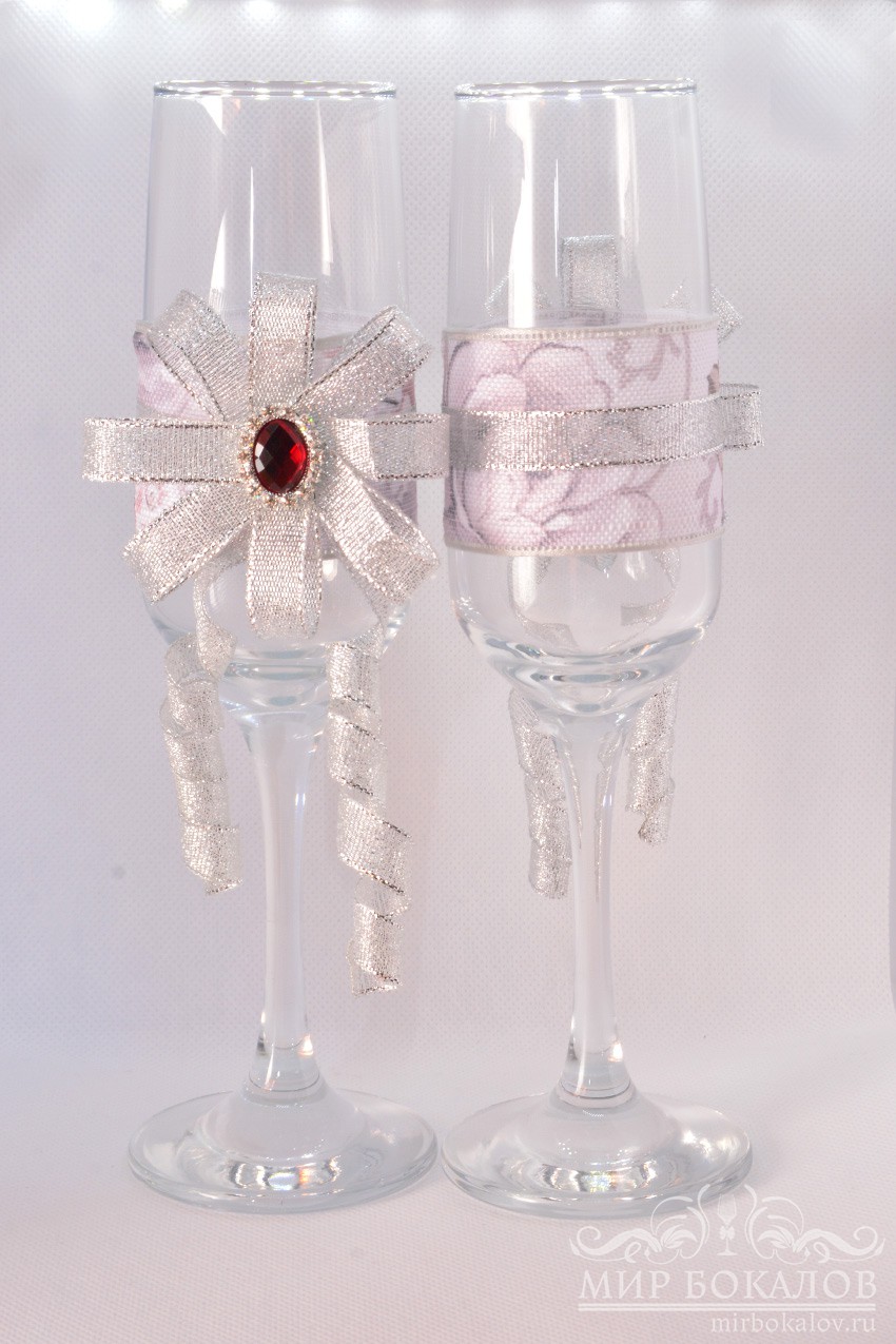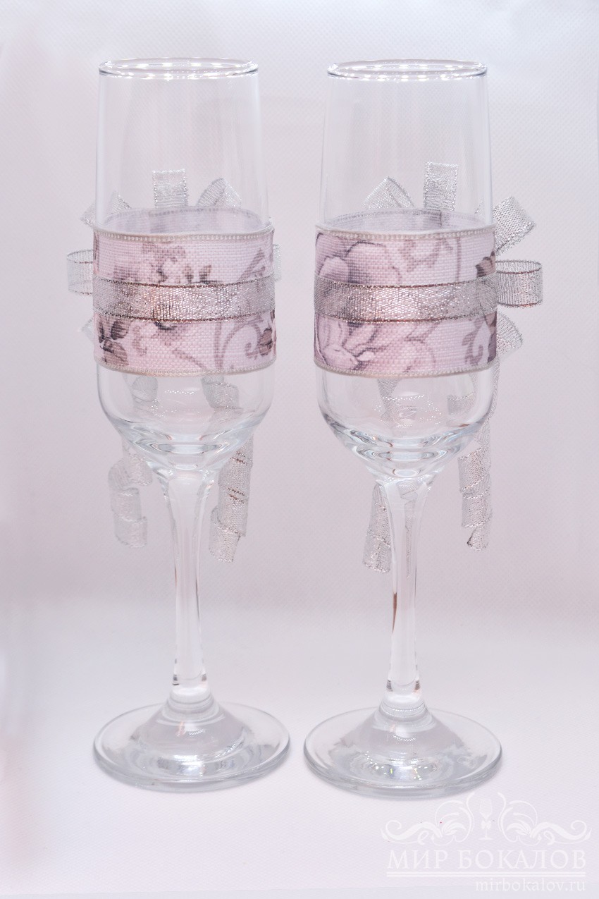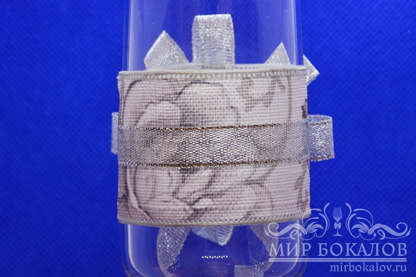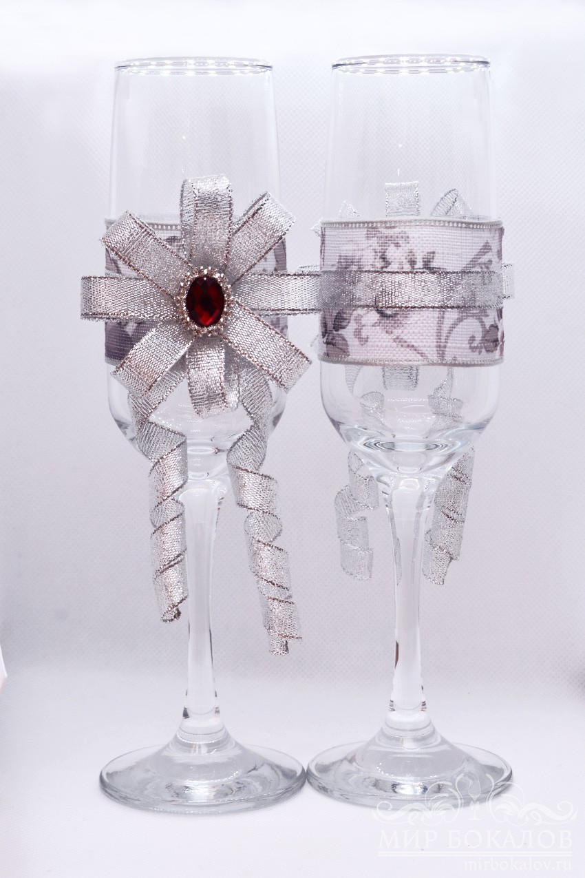 Набор из двух бокалов, украшенный лентами с декоративным рисунком и бантиком (ленты из парчи под серебро).